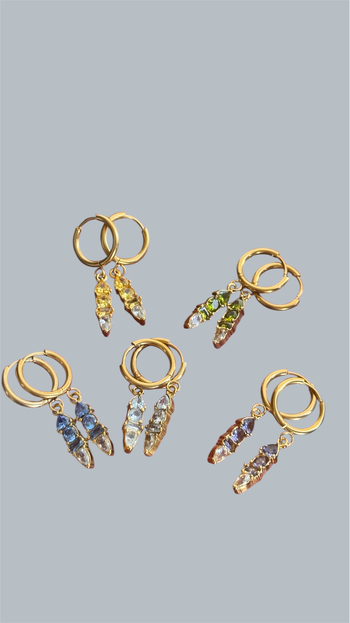 Aros light en piedras de topacio, topacio blanco, peridoto, amatista y citrino. Súper livianos, en acero de titanio, hipoalergénicos.